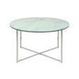 The Alisma coffee table features white crystal clear marble-effect glass with chrome metal base. This round piece brings luxury aesthetics at an accessible price point.