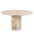 The Naxos table showcases natural marble in warm Latte brown tones throughout top and pillar base. The matt lacquer finish protects stone while maintaining natural character. At 130cm diameter, comfortably seats 4-6 people while the substantial 153.1kg weight reflects quality marble construction. The pillar base provides stability and sculptural modern appeal. Perfect for upscale dining spaces seeking natural stone luxury.