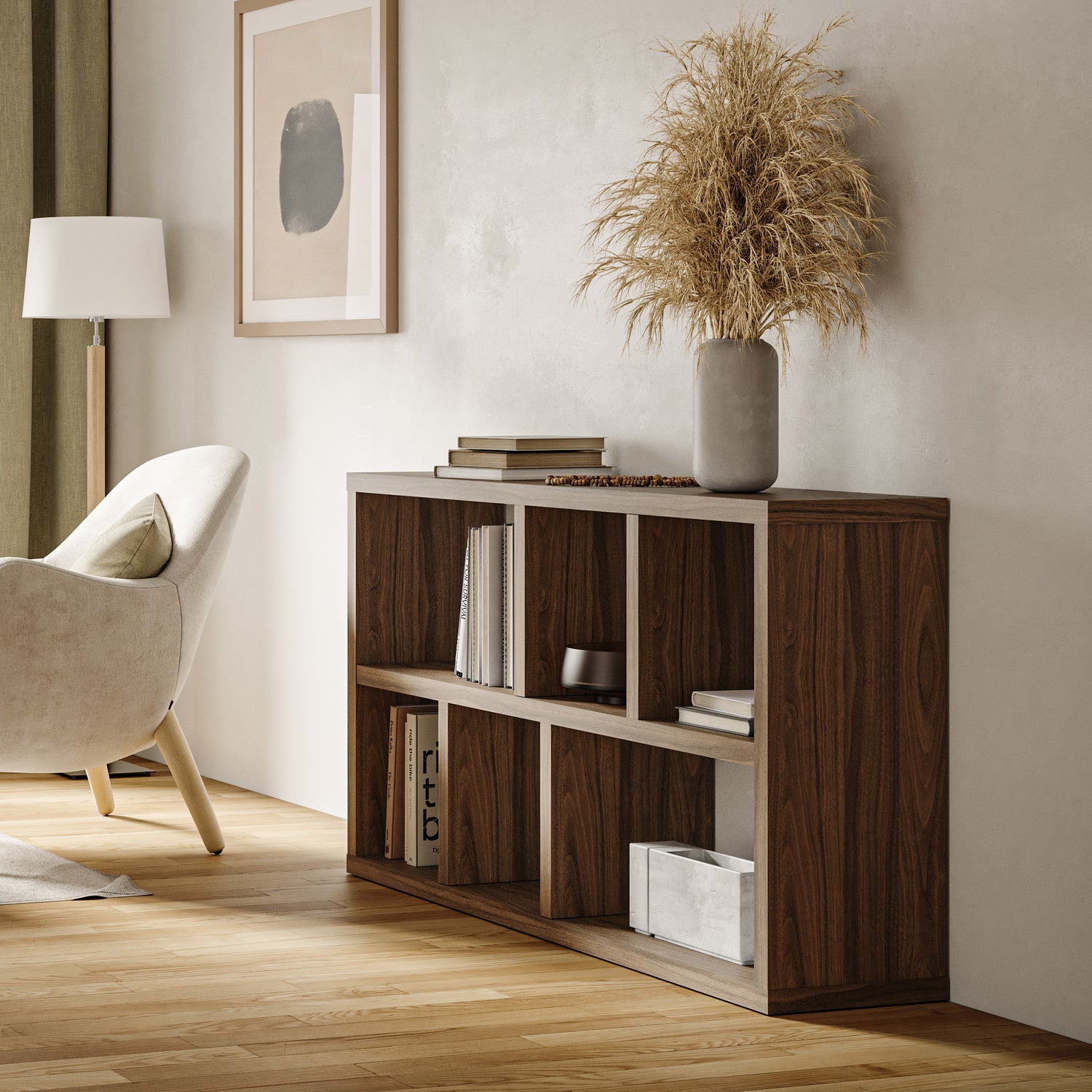 - Spacious shelving layout for books, décor, and accessories