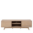 Supported by a sturdy white pigmented oiled oak base, the unit ensures durability and stability while maintaining a cohesive design. Its smart layout includes two doors, three shelves, and an open compartment, providing flexible storage for media devices, accessories, and everyday essentials.
