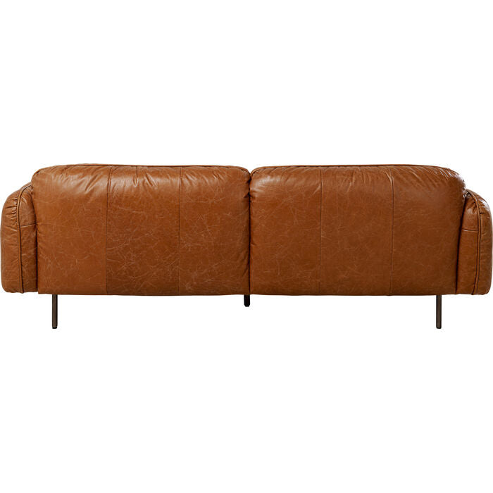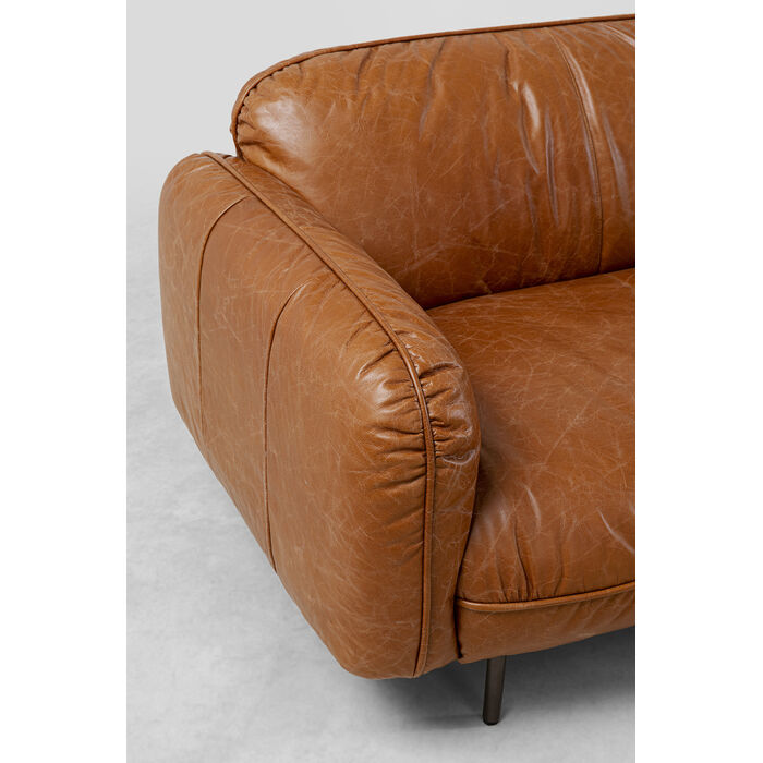 This two-seater sofa in a luxurious vintage design featuring brown leather will be a friend for life. A leather sofa like Calgary is not only a stylish piece of furniture for the living room, but also an investment in quality and durability. Leather sofas tend to last longer than fabric sofas and develop a unique patina over time. Calgary is a two-seater sofa with comfortable seat cushions and backrests that provide maximum comfort. The luxurious brown leather design adds timeless elegance and style to any room. The modern sofa is upholstered in semi-aniline leather. The leather has a natural grain, which is preserved by light aniline dyeing. It is resistant and at the same time soft and smooth.