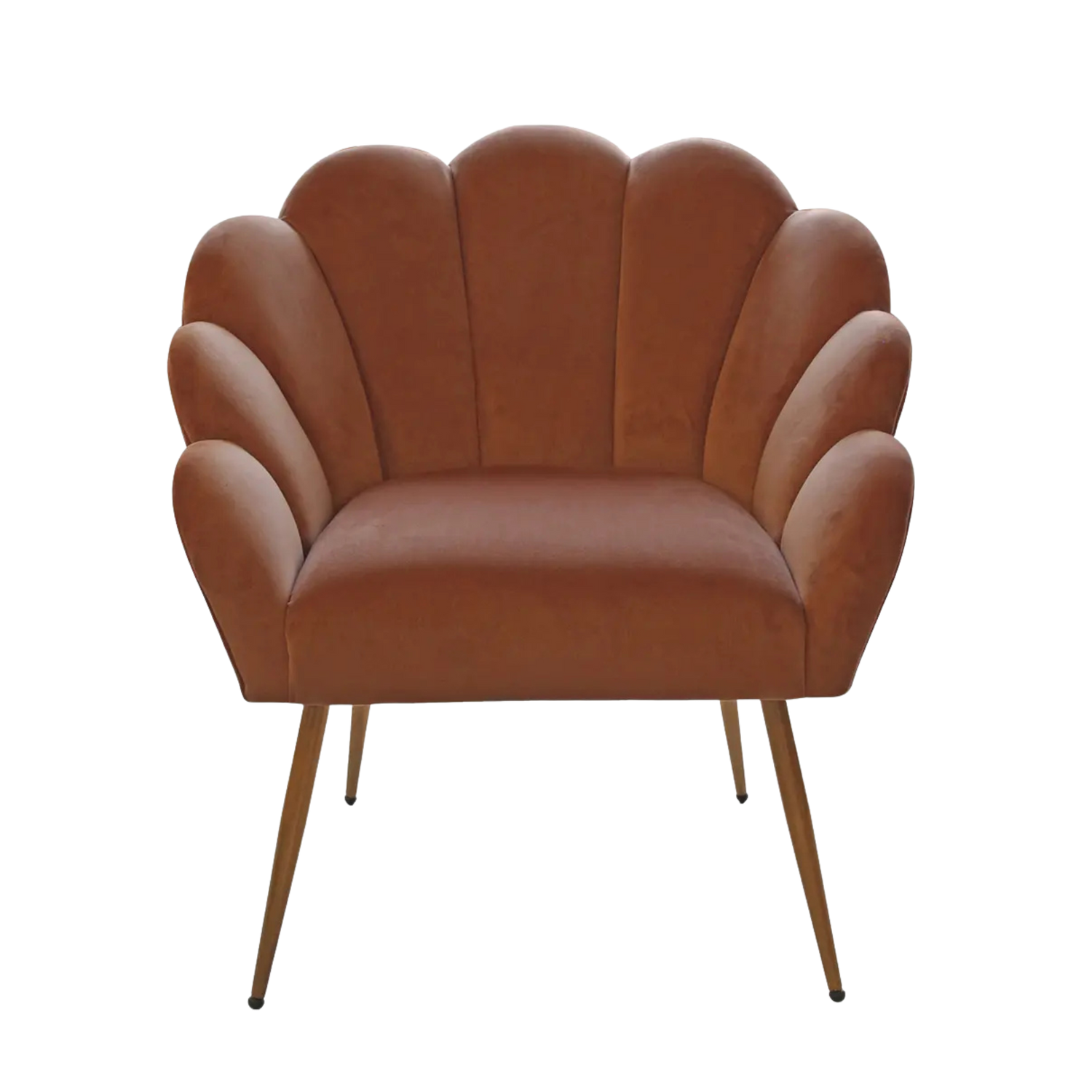This elegant armchair in unique rust color features a distinctive seashell-shaped design. The organic form combined with warm rust tones creates a stunning focal point.