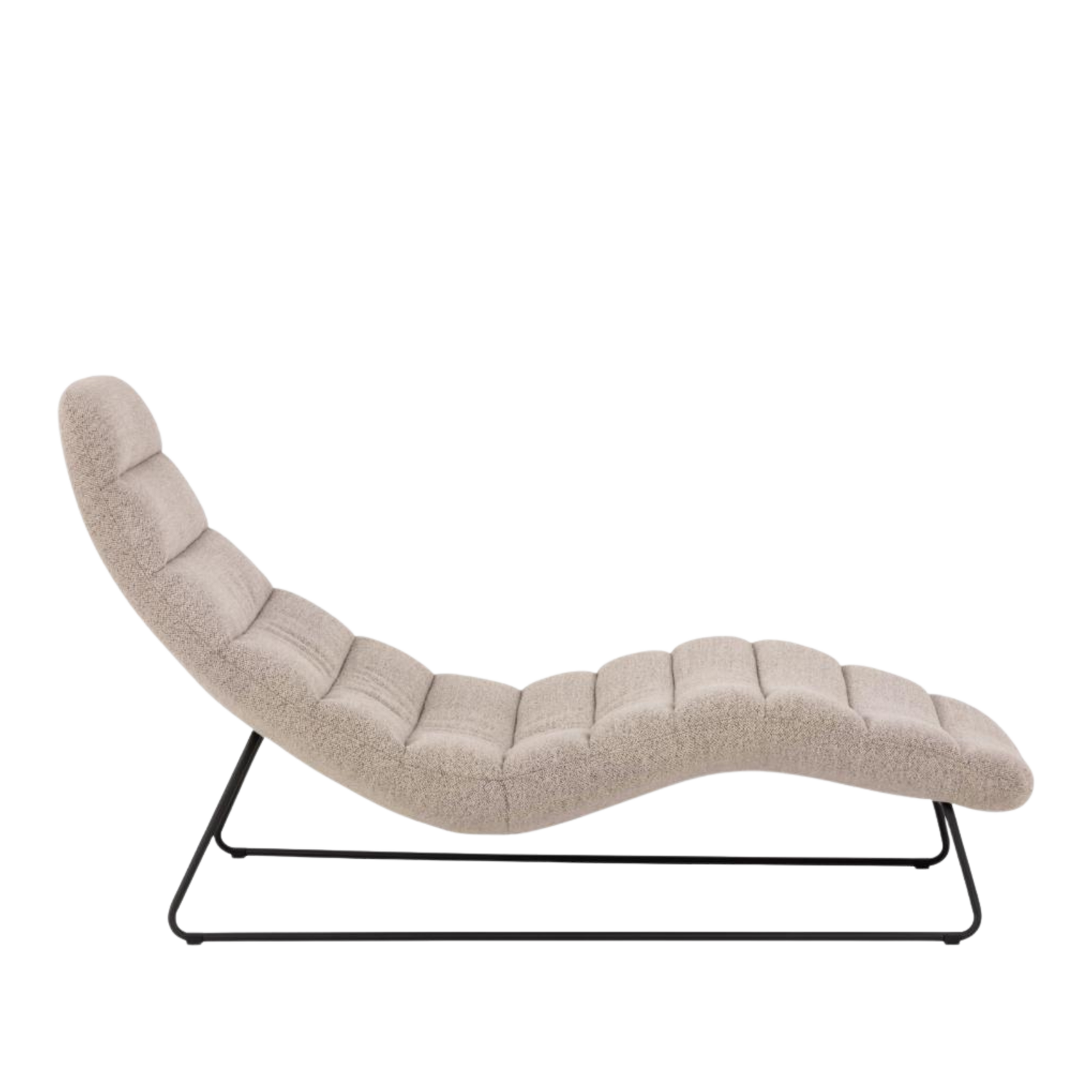 The Chaplin chaise longue offers rich, warm tones through Kentucky mix fabric. The textured material adds tactile interest while horizontal stitching enhances the contemporary aesthetic. The extended length provides full-body support for ultimate relaxation, while the matt black steel base ensures stability with modern industrial appeal.