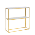 The Alisma console combines white marble-look glass with glamorous gold chrome base for sophisticated entryway appeal. The narrow 26cm depth makes it perfect for hallways where space is limited, while the 79.5cm length provides practical surface for keys, mail, and décor. The crystal clear glass with realistic marble pattern creates upscale elegance in tight spaces.