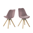 The Dima chair showcases dusty rose velvet upholstery bringing soft romantic appeal paired with natural oak legs for Scandinavian warmth. The velvet texture adds luxury while the wooden legs ensure durability. Perfect for adding feminine elegance to modern dining spaces seeking comfortable, stylish seating.