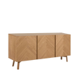 The body is furniture board covered with oiled oak veneer. The chest is based on four legs made of solid oiled oak wood. The legs are slightly tilted making it stable. Three fronts conceal cabinets with shelf. The fashionable herringbone pattern brings contemporary character while Scandinavian design maintains timeless appeal perfect for modern dining or living spaces.